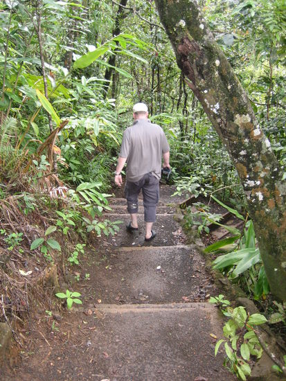 Wir machen viele Fotos und klettern dann wieder hoch. Vor uns läuft die ganze Zeit hektisch ein Truthahn die Treppe hoch. Er ist einfach zu blöd, einfach wieder in den Wald zu hüpfen!