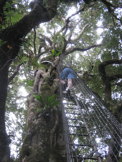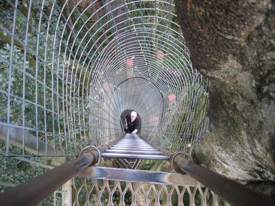 In der Mitte ist eine Leiter an einem Baum befestigt, an der man in den Wipfel des Baumes (30 m) klettern kann. Dies machen wir auch nacheinander, was ganz schön spannend ist. Für Leute mit Höhenangst ist dies sicher nichts!