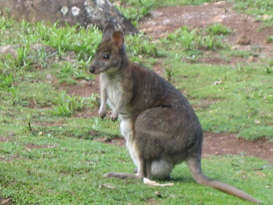 Tun wir aber nicht. Dann fahren wir zurück zum Campingplatz, wo wir uns häuslich einrichten. Strom gibt es hier nicht, auch das Toilettenhäuschen ist gesperrt und wird lautstark restauriert. Egal, in unserem Camper sind wir autak! Wir ruhen uns eine Weile aus, bauen unsere Campingstühle auf und genießen die Aussicht. An uns vorbei hüpfen kleine Wallabys, die alle Babys im Beutel haben. Sehr niedlich und überhaupt nicht scheu!