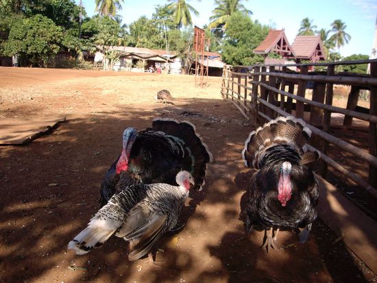 Als ich dann los bin nach Paksong musste ich eine Stunde an der "Bushaltestelle" auf mein Sangthaew warten. Das war auch noch mal toll - balzende Truthaehne neben mir, Schweine, Kueken. Also eins ist mir bis jetzt bewusst geworden: Ich muss auf jeden Fall irgendwann irgendwo leben wo keine asphaltierten Strassen sind und die Tiere froehlich durchs Dorf laufen.