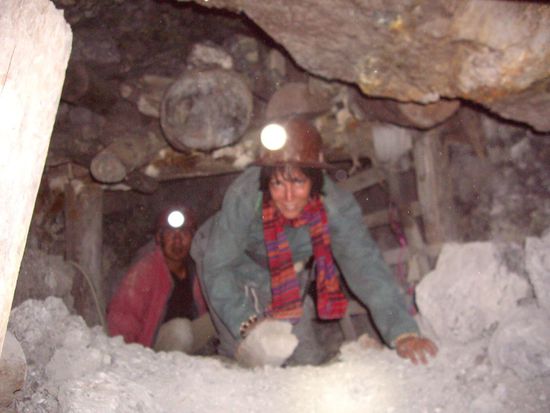 Dann geht das Abenteuer los. Gebückt laufen, durch enge Gänge krabbeln, Leitern runter und wieder rauf, wo teilweise die Sprossen schon gebrochen sind, über Holzbretter, wo man schon beim Hingucken ausrutscht. Und das alles auf ca. 4500 m ohne viel Luft... Ich war nur froh, dass unsere Gruppe nicht das 15 m lange Seil hoch und wieder runter musste. Schliesslich hatte ich nicht vor in der Mine zu sterben, ich hab ja noch Pläne in Katalonien