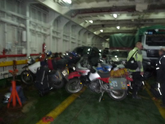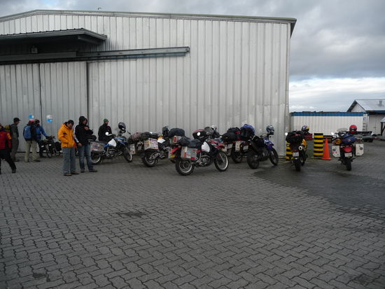 Heute sind wir spät aufgestanden da wieder Regen angesagt war. Inzwischen kochen wir unseren echten Kaffee selber da es in Chile fast nur Pulverkaffee gibt. Nach der Frühstück haben wir wieder gepackt und die Motorrad Wäsche war fast trocken. Hatten beschlossen erst gegen 16 Uhr von Castro nach Quellon zu fahren, was die richtige Entscheidung war. Es regnete aber deutlich weniger. In Quellon nach ca. 1000 Km traf ich 2 Kanadier wieder, die mit mir gleichzeitig an der chilenisch argentinischen Grenze angekommen waren. Gegen 19 Uhr sind wir dann zum Hafen und es waren 8 Motorräder da. 3 Brasilianer 2 Kanadier eine Ecuadorianer, Dominik aus Deutschland und ich, alle mit dem gleichen Ziel. Die Brasilianer, so wie ich es aus Brasilien kenne, haben gleich ihre eigenen Sticker verteilt.