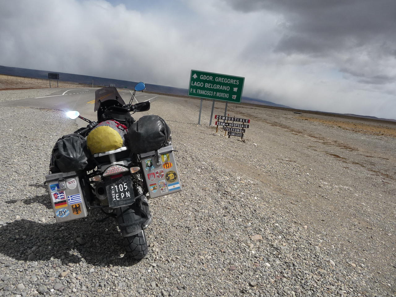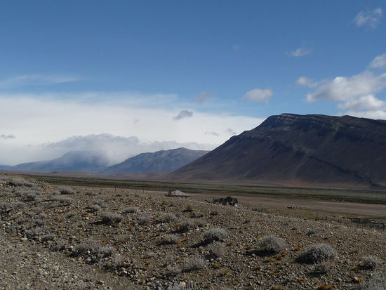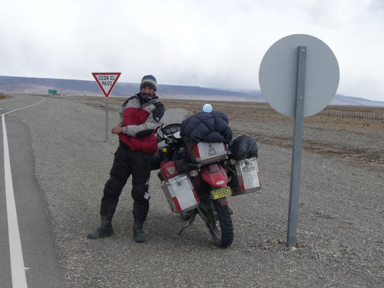 Bin dann zum Comedor und traf dann ein Ehepaar welches auch mit einer 1200GS unterwegs war. Ich hatte die Maschine schon vor einem Hotel in Perito Moreno gesehen. Haben uns eine Weile unterhalten und beschlossen dann am nächsten Morgen uns auf der Strecke zu treffen. Wir trafen uns dann in EL Chalten am Fuße des Fitz Roy. Leider war es nur an diesen Tag an den Gipfeln bewölkt, sonst nirgendwo. Also mehr oder weniger um sonst hingefahren. Unterwegs fuhr ich in eine Estanzia um für 2 Liter Benzin zu betteln, sonst wäre ich vielleicht nicht angekommen. Die Fahrt dahin war wieder mit Seitenwinde gut bestückt, die auf der Rückfahrt etwas nachgelassen haben.