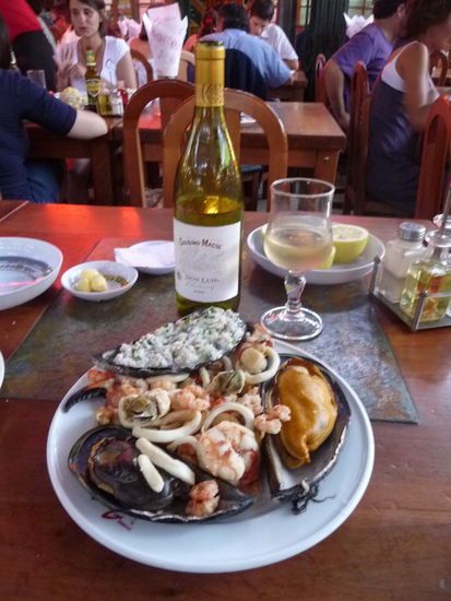 Ja eines noch, ich habe es mir nicht vernkniffen und doch den "Garten der Meeresfrüchte" bei "donde Augustin" im Mercado Central bestellt( es gibt sicher bessere Adressen). Weiss nun nicht was ich mit diesem gewaltigen Eiweissstoß nun bis morgen anfangen soll- Der Chardonnay von Cousinho Macul passte hervorragend.