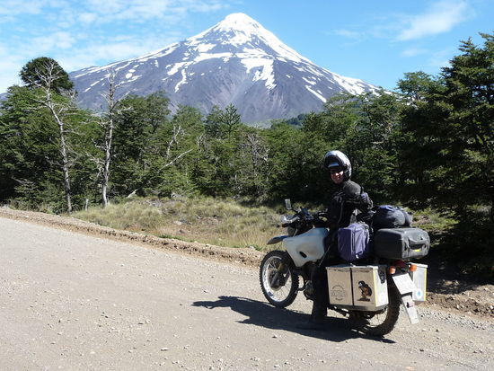 Morgens um 10 sind wir zu zweit gestartet in Richtung Villarica und Pucon. Bis dahin war alles ca. 80Km Schotterpiste. Imposant war der uns von weitem begleitende Blich des nun 2. Volkan Villarica der noch aktiv zu sein scheint, da man mit dem Fernglass sehen konnte das etwas weißer Rauch hochkam. Der ist aber nicht schwer zu sehen, er ist der einzig größere Berg in der Umgebung, schaut fast aus wie ein perfekter Vulkan und seine Spitze ist schneebedeckt. Und das Wetter hat doch noch gehalten obwohl es morgens bewölkt war. Es hatte deutlich abgekühlt so dass ich einen Pullover angezogen hatte. Am Vulkan vorbei sind wir an Pucon gelangt welches so wie Villarica auch ein Tourismusort ist. Dor haben wir uns eine Pizza schmecken lassen und beratschlagt wie es nun weitergehen soll. Ursprünglich wollten wir über ein See 100 Km südlich per Fähre nach San Martin de los Andes. Die Fähre geht jedoch 2-mal am Tag und es war keiner telefonisch erreichbar. So haben wir beschlossen den kürzesten Weg zur Grenze zu nehmen. Am Pass hatten wir auch um die 100 Km Schotterpiste. Die Grenzformalitäten haben wir prompt erledigt und durften schnell weiterfahren.
