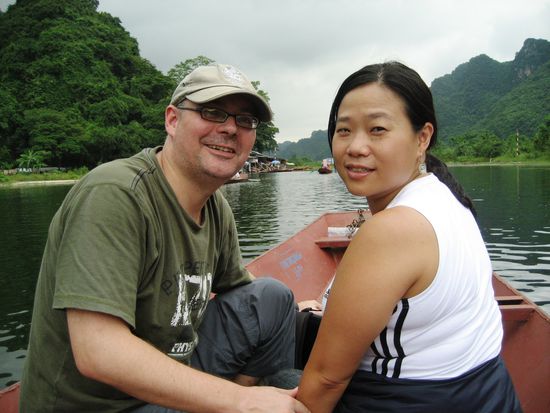 Eine weitere organisierte Tour brachte uns zur Perfume Pagode...per Bus gings raus aus Hanoi, nach ca 2 Std Fahrt wurden wir von Frauen (ausschliesslich Frauen!) in mehrere Boote verteilt und den Fluss hoch gerudert. Ganz nett, aber auch recht warm, trotz bewoelktem Himmel. Angekommen gings per Cable Car hoch...man haette auch laufen koennen, das haben wir lieber sein lassen. Oben mussten wir dann trotzdem noch einige Stufen hoch und wieder runter laufen: Ich schon wieder klatschnass! Die Cave war ganz nett und wird von den Buddhisten u.a. besucht, falls man sich Kinder wuenscht!