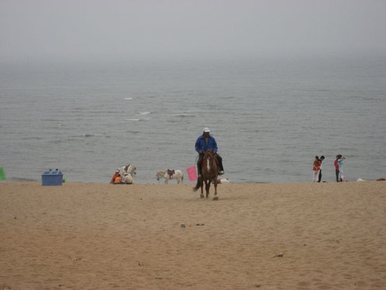 Wir sind dann erstmal um den abgesperrten Bereich herum- und zum Strand gelaufen. Dort angekommen kam gleich ein Chinese auf nem Pferd auf uns zu (wir waren die einzigen Westler), ob wir nicht reiten wollen. Da die Pferde ordentlich gepflegt aussahen, haben wir uns überreden lassen.
