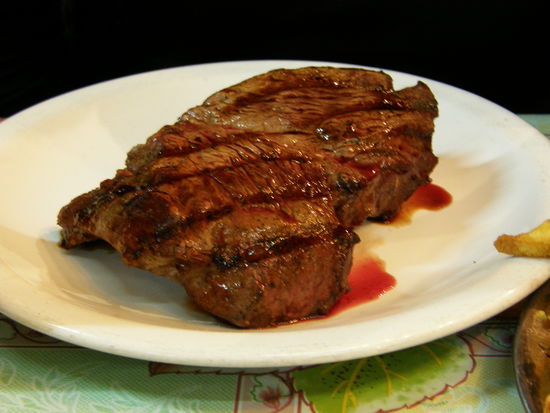 Abends fand dann quasi zu Beginn unserer Reise der kulinarische Hoehepunkt statt, als wir in einer Parilla (Grillstube) namens "Desnivel" echtes argentinisches Steak aus der Lende (bife de lomo, natuerlich Rind) gegessen haben. Es war das groesste und dickste Steak, das ich jemals gesehen habe, war aber so perfekt gegrillt und saftig - einfach unglaublich!