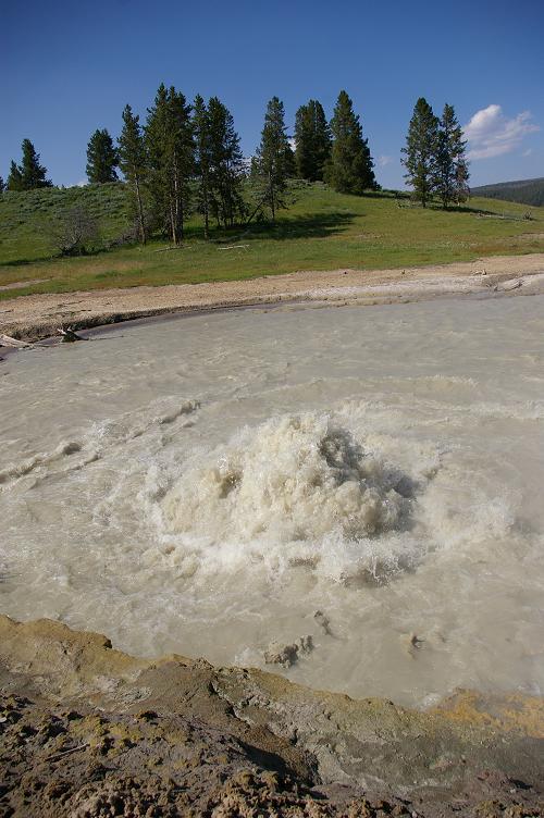 Am ersten Tag ging es mit zwischendurch vielen Kurztrails an diversen Hot Springs und blubbernden, qualmenden Töpfen (a la Iceland) zum Upper Basin und seinem berühmtesten Geysir, dem Old Faithful. Dieser erfreut das gemeine schaulustige Besuchervolk mit Fontänen bis zu ca. 50m Höhe alle ca. 90 Minuten. Dies haben wir an diesem Nachmittag 2x erleben dürfen. Zwischendurch Brustbeutel mit allen Karten und Papieren liegen lassen (und vollständig wiederbekommen), Rundtrails und Shoppen... Das Wetter war erstmals länger unschön - mit bis zu 2h ohne Sonne und 30 Minuten Gewitter dabei - der bislang schlechteste Tag ).