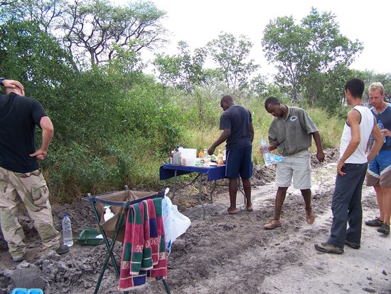 Der Abend war dann sehr nett, in der camp-eigenen Küche, die mit allem Pipapo ausgerüstet war, kochten wir Spaghetti Bolognese und wir hatten ja immerhin 2 italienische Experten dabei ! Es wurde also sehr lecker. Unüblicherweise erschien sogar L. zum Essen, aber nach 2 Gabeln voll schmiss er das Besteck hin und verschwand in seinem Zelt. Wir beratschlagten, was wir tun sollten mit ihm. Unser Guide sagte, er habe diesbezüglich bereits mit Windhoek telefoniert, er könne ihn jetzt echt jederzeit rausschmeißen, insbesondere wenn wir darauf bestünden. Aber wir einigten uns darauf, ihn die paar letzten Tage auch noch ertragen zu können. Zumal er uns ja nichts tat. Er sorgte hin und wieder für Verzögerungen, war ständig blau, aber wurde nie ausfallend. Er gefährdete nie uns, nur sich selbst. Nein, er sollte bleiben, entschieden wir. Nur ich hatte noch eine kleine Bitte für den morgigen Tag: Morgen sollte es in Mokoros (Einbäumen) durch´s Okavango Delta auf eine unbewohnte Insel gehen, immer zu zweit + Poler pro Mokoro. Ich wollte mir das Mokoro auf gar keinen Fall mit L. teilen, weil ich seine unvorhersehbaren Aktionen fürchtete und keine Lust hatte, aufgrund irgendeiner seiner spontanen Ideen im Schlund eines Hippos/Krokodils zu landen (er hätte es sicher nicht böse gemeint, aber dennoch...). Ich bot sogar an, für ein Einzel-Extra-Mokoro zu bezahlen, aber selbstverständlich hatte jeder Verständnis für meine Bedenken und mir wurde zugesichert, mir den Einbaum mit Marvin teilen zu können. Unser Chef-Guide opferte sich für die Fahrt mit L.