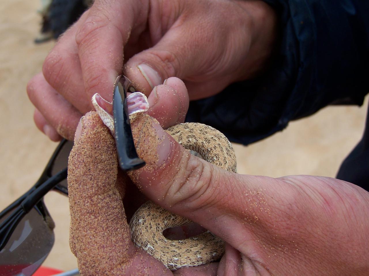 Eine kleine Schlange hatte unser Guide gefangen und zeigte sie uns. Mit dem Brillenbügel hielt er sie nur vom beissen ab...