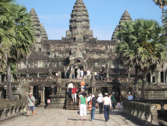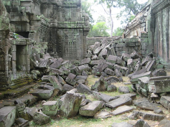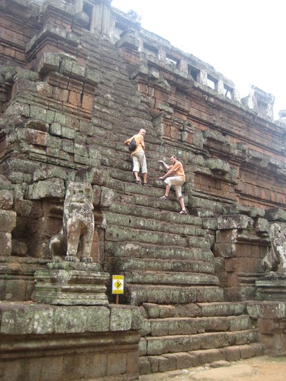 Wir fuhren schließlich nach ausgiebiger Exkursion in der Hauptstadt mit dem Bus nach "Siem Reap" wo die berühmten Tempel von Angkor beheimatet sind. Die Tempelanlagen bildeten vom 9. bis 15. Jahrhundert das Zentrum des Khmer-Königreiches. Bei einer Gesamtfläche von mehr als 200 km² sind die Tempelanlagen - allen voran der berühmte Angkor Wat, der größte Tempelkomplex der Welt. Wir buchten eine Tour und wurden von unserem erfahrenen Reiseführer in seinem Tuk-Tuk quer durch die Anlagen geführt. Viele Touristen buchen eine 3-Tagestour um die beeindruckenden Tempel zu bewundern, uns genügte allerdings nur ein Tag und selbst dann träumten wir nachts nur noch von Tempeln... Viele Tempel sind zerstört, teilweise nur noch ein Trümmerhaufen doch dem Touristen ist es trotzdem erlaubt auf meterhohe Komplexe zu klettern und zwischen Trümmerhaufen zu stöbern - in Deutschland unvorstellbar!!! So erkundeten auch wir, vorsichtig und mit Bedacht, die Überreste der Tempel, oder was davon noch übrig war.