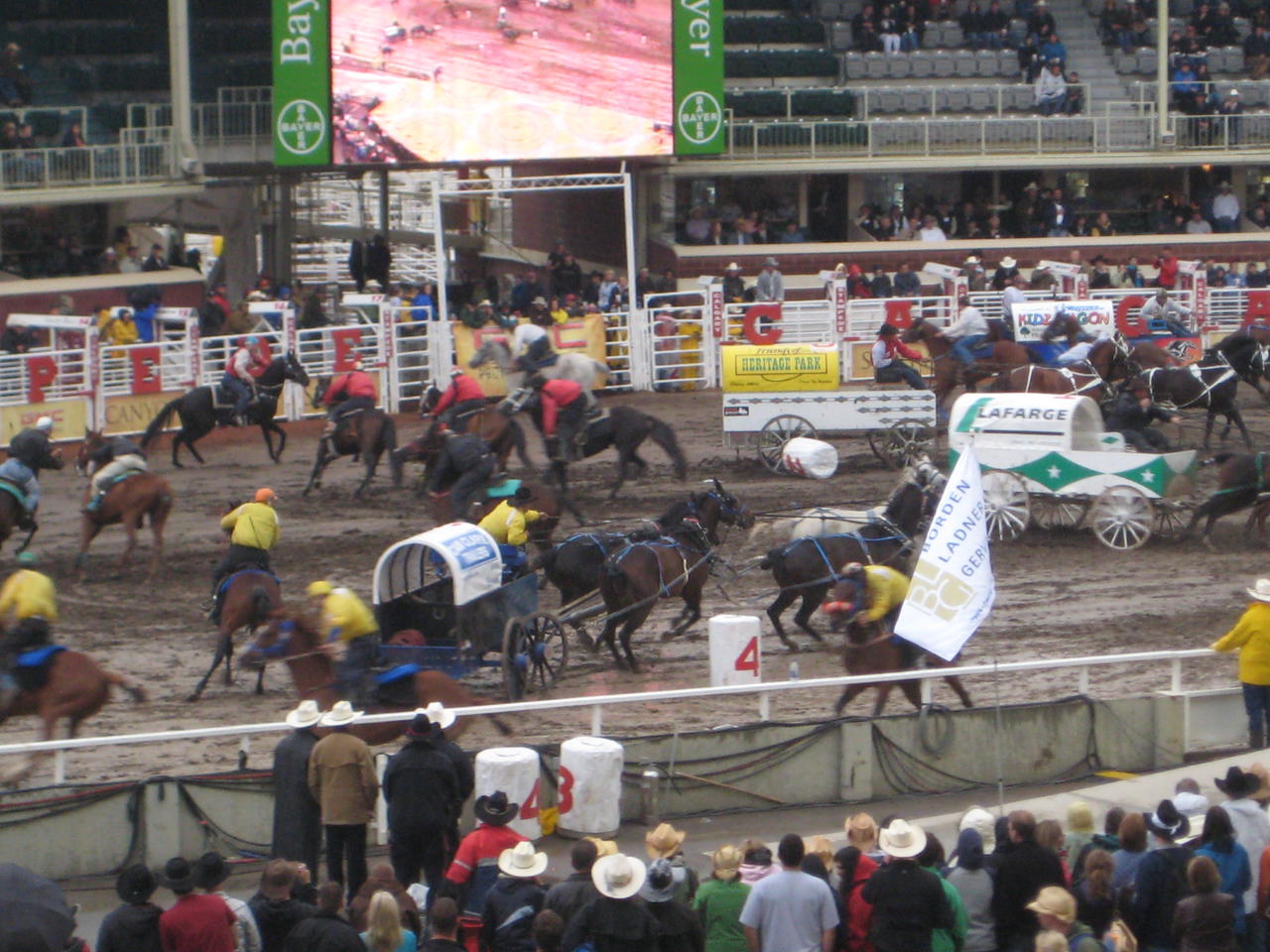 Der letzte Tag an dem wir die Stampede besuchten waren die "Chuckwagen races", die Wagenrennen. Wir kannten zwar die Regeln nicht und es war auch ziemlich kalt und windig, aber wir waermten uns mit heissem Kaffee und die Rennen waren auch interessant einmal gesehen zu haben.