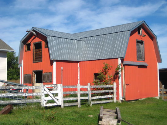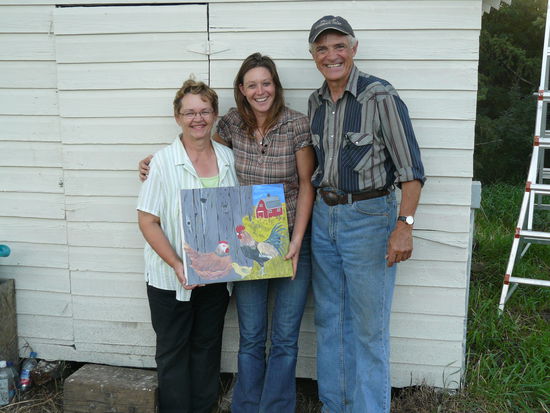Als wir die Gartenhuette renovierten erwaehnte Bev dass sie ein Bild an die Tuere der Huette haengen wolle und ich hatte ihnen versprochen dass ich ihnen ein Bild aus Acrylfarben male. Bev liebte Gockel. Saemtliche Gegenstaende schienen aus Gockelmotiven in allen Farben und Formen zu sein, ob es Tassen, Untersetzer oder Bettueberzuege waren. Also malte ich einen Gockel mit Henne und Kuecken und im Hintergrund eine typisch kanadische Scheune mit Blumen im Vordergrund. Das sollte mein Abschiedsgeschenk sein und ich sass viele Stunden daran. Bev und Barry haben sich sehr darueber gefreut.