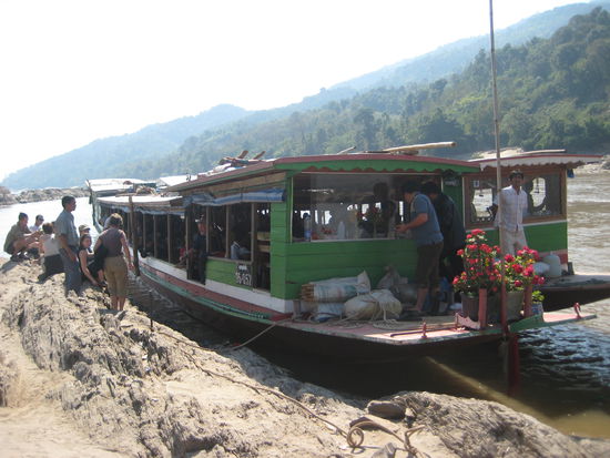 Von der thailändischen Seite kommend setzte sich also unsere Reise auf dem Mekong nach Laos fort, mit dem Ziel in zwei Tagen nach "Luang Prabang" zu gelangen. Die umliegende Berglandschaft auf dem Mekong ist fantastisch. Hier und da kann man Büffel oder Ziegen beobachten die sich in der Sonne räkeln. Manchmal entdeckt man auch junge Frauen, die ihre Wäsche im Fluss waschen oder Männer die fischen gehen. Ab und zu schipperten wir langsam an ein Ufer heran, entdeckten dann versteckt hinter einem Hügel ein kleines Dorf, und erfuhren dass wir Proviant für die Dorfbewohner auf- bzw abluden. Einige neugierige und wissbegierige Touristen, nutzten die Gelegenheit um mit den Einheimischen ins Gespräch zu kommen, doch die sprachlichen Barrieren ließen den Enthusiasmus bald verebben.