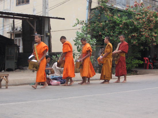 Nach einer leckeren Nudelsuppe zum Frühstück beobachte ich (Sven) um 6Uhr morgens den Almosengang der Mönche bei dem sie Essensspenden von dem Anwohnern erhalten.