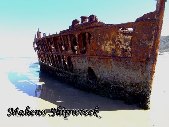 Die Maheno wurde 1905 in Schottland gebaut und war eines der modernsten und schnellsten Schiffe dieser Zeit. Es wurde während des ersten Weltkriegs als Lazarett-Schiff verwendet. 1935 wurde es dann an eine japanische Firma als Altmetall verkauft. Während der Überfahrt nach Japan, im Schlepptau eines anderen Schiffes, wurde es von einem Zyklon überrascht und das Abschleppseil riß! Am 9. Juli 1935 wurde es an die Küste von Fraser Island geschwemmt. Alle Versuche, es wieder frei zu bekommen, scheiterten, es versank nur noch tiefer im Sand. Seit 73 Jahren steckt es also jetzt an der Ostküste von Fraser Island fest.