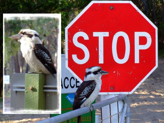 Dingos begegneten mir keine, aber dafür ein total süßer, neugieriger Kookaburra, der es zu genießen schien, dass ich Fotos von ihm machte Er saß erst auf dem Boden, dann auf einem Posten (siehe kleines Bild) und dann setzte er sich auch noch vor ein Stopschild, echt lustig! Ich hatte viel Spaß mit ihm und hoffte, der Tag würde so weitergehen...