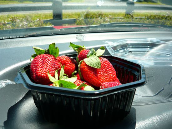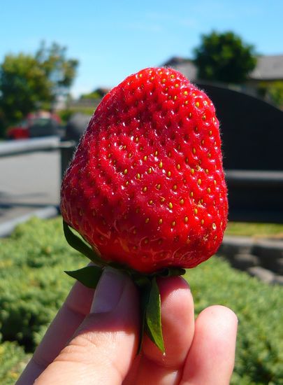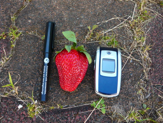 Ach ja, hier noch was interessantes: der Größenvergleich einer neuseeländischen Erdbeere, eines Stiftes und meines Handys: