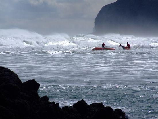 Und ein paar Meter weiter trainierten die Rettungsschwimmer mit ihren Rettungs-Schlauchbooten, die hier sehr oft zum Einsatz kommen. Eines davon (das linke) hatte sich gerade auf den Kopf gestellt und der Rettungsschwimmer versuchte, es wieder umzudrehen. Gar nicht so einfach bei diesen fiesen Wellen