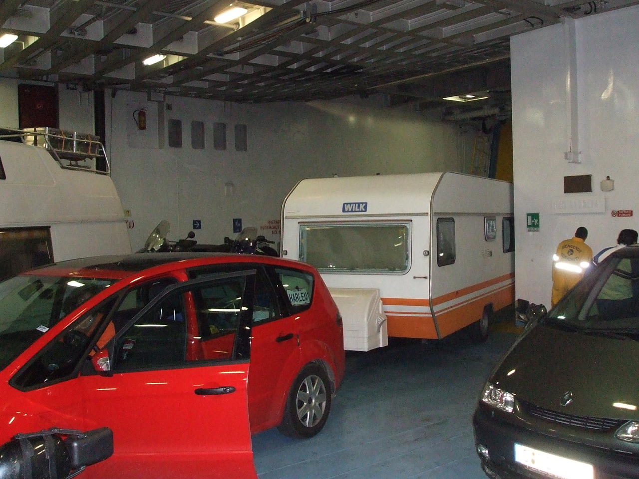 Das Entladen dauert ewig. Mit der Einfahrt müssen wir mit einer Handvoll anderer Gespanne bis zum Schluss warten. Dann werden wir eingewiesen und so hin dirigiert, dass unser Gespann abgewinkelt am Heck der Fähre steht und der Wohnwagen gerade mal 5 cm von der Trennwand zwischen den beiden Einfahrtstoren der Fähre entfernt steht.