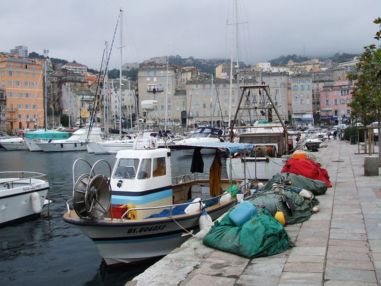 Gegen 16 Uhr fahren wir dann nach Bastia. Über dem Col de Teghime hängen dicke Wolken und es ist ziemlich stürmisch. Dichte Wolken rasen über den Col und mit 20 km/h bei einer Sichtweite von 10-15 Meter schleichen wir über den Pass. Die Wolken hängen tief über Bastia. Auf der Ostseite ist es viel trüber als an der Westküste. Wir kommen gerade rechtzeitig zur Rushhour Bastias. Wer zu dieser Zeit eine Fähre erreichen will/muss, tut gut daran, reichlich Fahrzeit einzukalkulieren, wir haben da auch schon unsere Erfahrung gemacht. In Bastia im Stau stehend haben wir vor vielen Jahren nur durch aberwitzige Fahrmanöver - Einbahnstraßen in Gegenrichtung fahrend usw. - die Fähre gerade noch knapp erreicht.