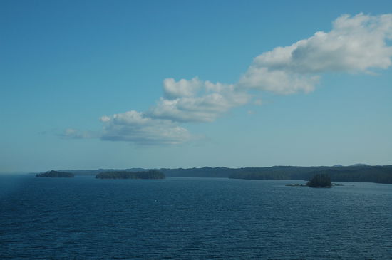 Und die ist wirklich herrlich! Wir befinden uns ca. auf der Höhe, wo ein Fjord nach Bella Coola hinein führt. Also erreichen wir schon bald die Grenze nach Alaska. Rechterhand begleiten uns die majestätischen Schneegipfel der canadischem Küstenberge und linkerhand erblicken wir verstreute einsame Inseln. Die ganz grosse Vancouver Island scheinen wir bereits hinter uns gelassen zu haben.