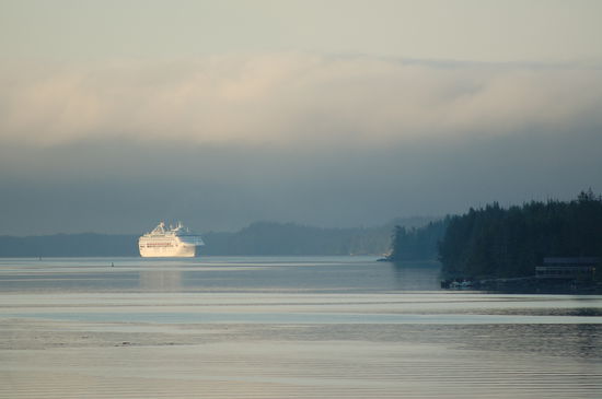 Der Morgen ist wirklich atemberaubend schön. Unser Schiff gleitet lautlos durch die einsamen Fjorde, das Wasser wirft kaum Wellen. Doch immer mehr Häuser tauchen linker- und rechterhand auf. Wir nähern uns Ketchikan. Nebelschwaden umhüllen teilweise Gebirgszüge und lassen die Landschaft mystisch erscheinen. Als wir uns auf unserem Rundgang grad wieder am Heck des Schiffs befinden, erblicken wir ein zweites schneeweißes Kreuzfahrtschiff, das sich elegant um eine Flussbiegung windet und langsam hinter uns herfährt. Eigentlich gibt es nichts schöneres als den erwachenden Morgen zu beobachten.