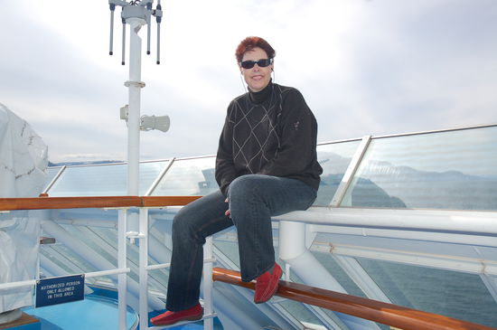Ein Holzgeländer rahmt irgendein nautisches Instrument neben mir ein. Das Geländer könnte sich hervorragend als Hochsitz eignen. Mit meiner mir angeborenen Eleganz zum Klettern (hüstel...) knorze ich mich auf den Ausguck und fühle mich wie die Königin des Schiffs. Unter mir pflügt der Schiffsbug majestätisch durchs Wasser und rundherum besticht die einsame Natur Alaskas. Was für ein Ausblick - was für ein Tag! Doch auch der schönste Ausblick lässt einem irgendwann das Hinterteil schmerzen, denn ein schmales Holzgeländer ist nicht grad das Höchste aller Bequemlichkeit.