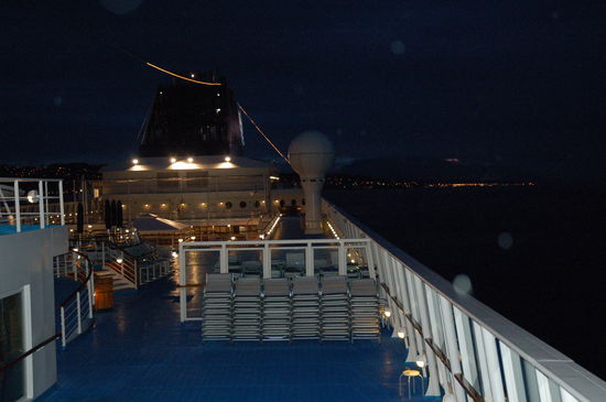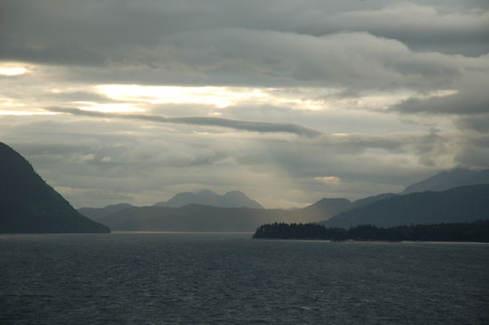 Nun was unter dem Schiff ist, erkennen wir natürlich nicht von hier oben. Dass aber das Land linker- und rechterhand immer näher rückt, schon. Auch das Wetter weint am letzten Abend. Es nieselt unangenehm. Eine ältere Lady gesellt sich zu uns. In einer weitaus angenehmeren Art als unsere englische Landlady beginnt sie ein Gespräch mit uns. Ihr Gatte ist Pilot, sie kommen aus Ontario und fahren morgen zu ihrer Tochter, die in Vancouver wohnt.