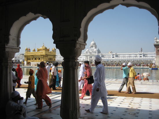 Innerhalb der weißen Außenmauern befindet sich ein heiliger Teich, in dem auch gebadet werden darf und im Goldenen Gebäude in der Mitte der Tempelkern der Sikh Religion, wo echte Anhänger sich über ein Stunde auf dem schmalen Steg dorthin anstellen, um ihn zu sehen.