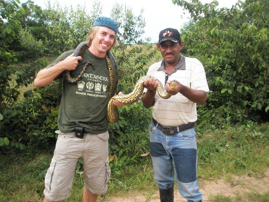 An naechsetn Tag ging es dann wieder mit dem Jepp weiter. Wir machten uns auf die Suche nach einer Anaconda. Was zu dieser Zeit eher schwierig ist. Da Regenzeit ist haben sie eine grosse Flaeche, in der sie sich aufhalten. Wir hatten auch kein Glueck und mussten nach zwei Stunden aufgeben. Wir sahen dafuer viel andere Tiere. Was auch grossen Eindruck macht, sind die vielen verschiedenen Vogelarten. Am Nachmittag versuchten wir noch einmal eine Anaconda zu finden. Und prompt hatten wir Glueck. Es war allerdings nur eine kleine (2m). Die koennen bis zu 9m lang werden. Aber es war trotzdem ein tolles Erlebins. Auch diese wurde natuerlich fuer einen Fototermin bei uns Touristen eingefangen