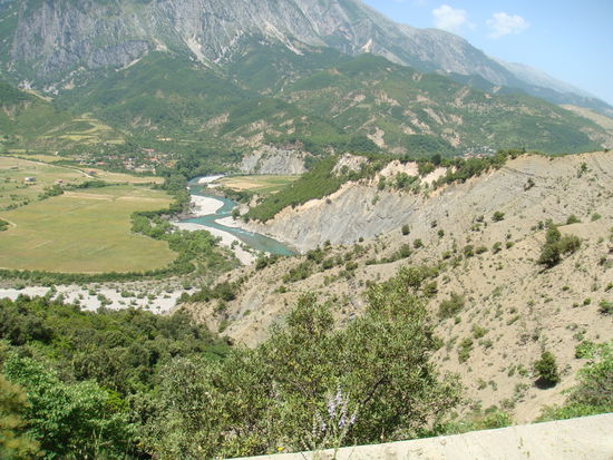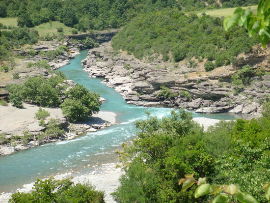 Nachdem es bereits um 7:00 Uhr 27°C warm war und wir unser Frühstück im Schatten genossen hatten, mussten wir nur noch abwarten bis alle Italiener ihre WoMo´s mit Wasser befüllt hatten, dann kamen wir dran und die Weiterfahrt konnte beginnen. Auf geht´s, dem Fahrer steht ein arbeitsreicher Tag bevor, tausende Kurven und Schaltvorgänge sind zu bewältigen.Trotz der vielen Kurven und der teilweise schmalen und unebenen Straßen werden alle Insassen von der überwältigenden Landschaft belohnt. Berge,Schluchten, der Fluss mit seinem grünen Wasser begleiten uns auf der Strecke Germanij bis Permet, für die man 4 Stunden Fahrzeit einplanen sollte. Auf der kurvigen Strecke muß man nach jeder Kurve nicht nur mit Gegenverkehr, wo es manchmal richtig eng wird, sondern auch mit plötzlich überquerenden Ziegenherden rechnen.