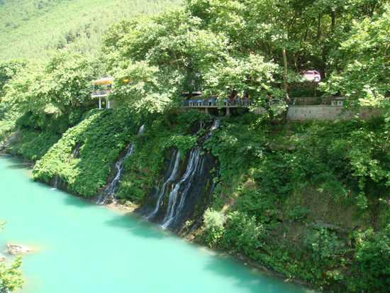 Nach einem knappen Kilometer, direkt an der Überfahrt der Staumauer wird dann 200 LEK für WoMo und 2 Personen kassiert.Nun folgt ein teilweise sehr schlechter und schmaler Weg der uns zum Parkplatz direkt am Wasser führt. In einer grünen Oase liegt das blaue Loch, eine Quelle aus deren Tiefe ein Fluss entspringt. Die tiefblaue Farbe gibt der Quelle ihren Namen.