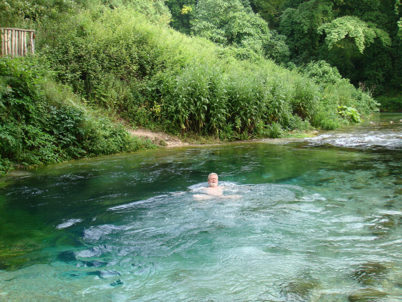 Ein Bad in dem 10°C kalten/warmen Wasser erweckt alle Lebensgeister. Nach Rückfrage bei den Restaurantbetreibern ist es kein Problem, was wir gehofft hatten, auf dem Parkplatz von 39°55´29´´ N 20°11´31´´O dem ständigen Rauschen des Flusses begleitet und von den Hunden bewacht,zu übernachten.