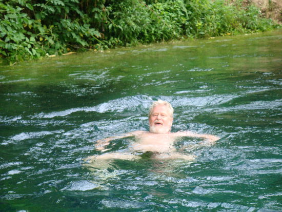 Die Erfrischung nach dem heißen Tag fanden wir im grünen Wasser des Flusses. Das Konzert der Frösche und Vögel wiegte uns, nachdem wir das erste mal auf der Tour unseren Grill in Betrieb hatten, in den Schlaf. Ende 8.Tag Km-Stand 2034