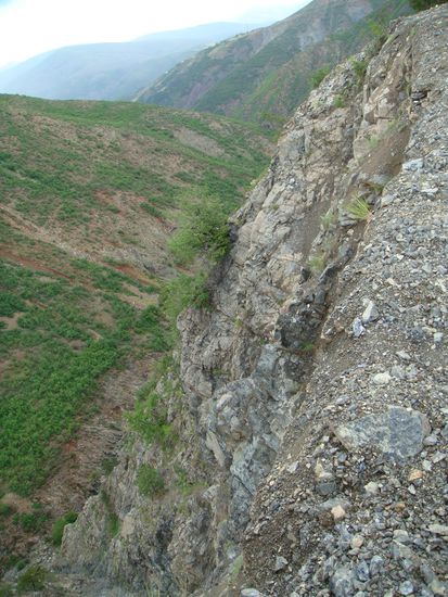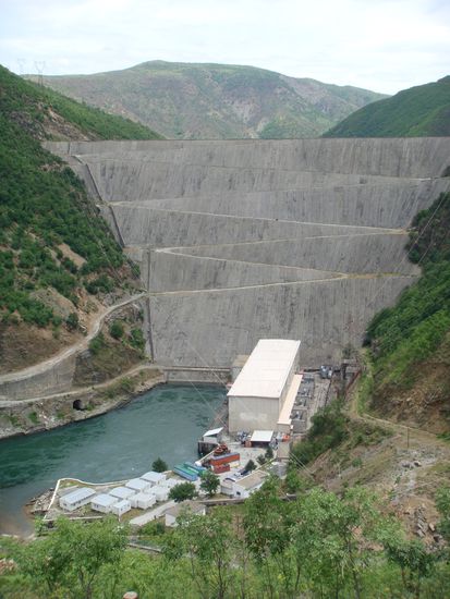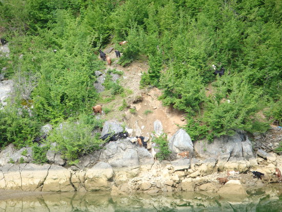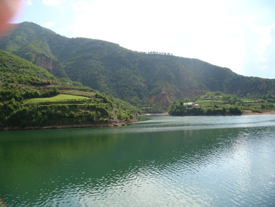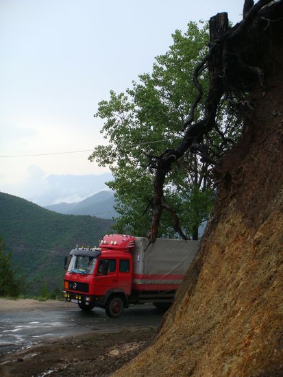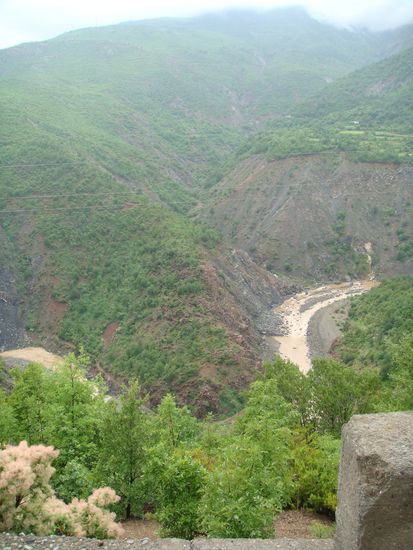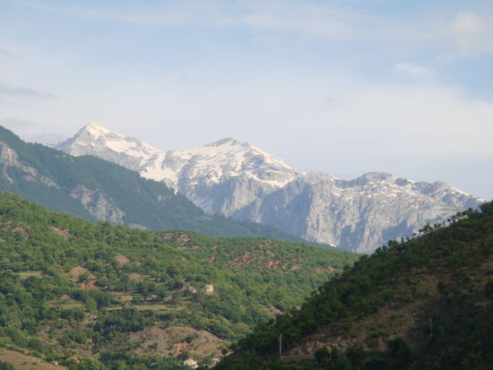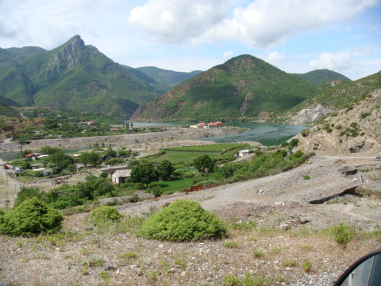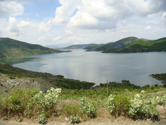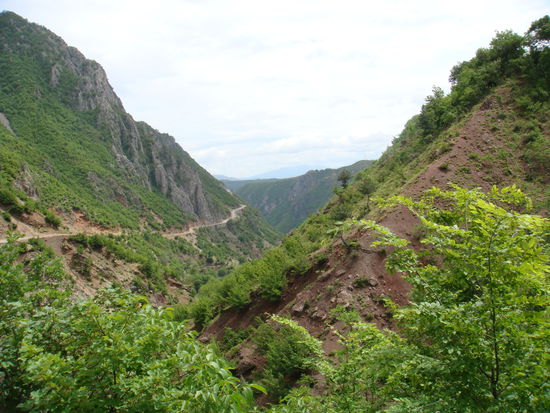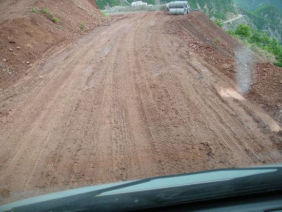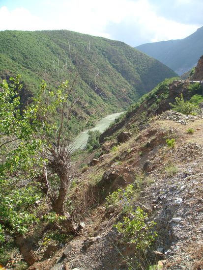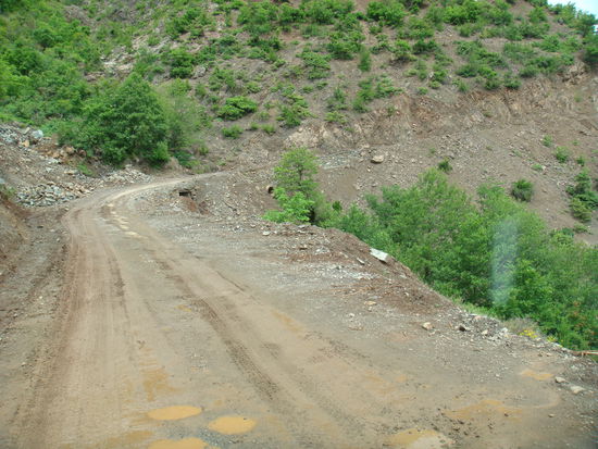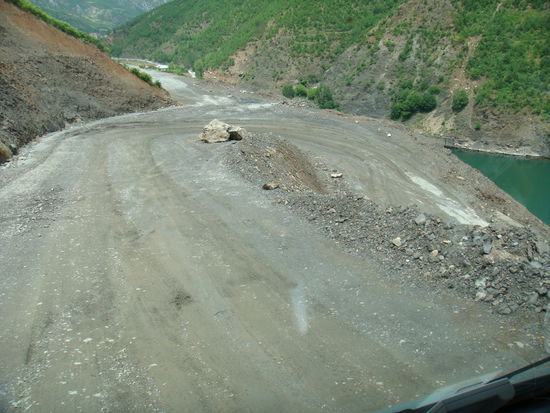 Hier sollte man besser die neue Schnellstraße Richtung Lac benutzen, zumal die Landschaft hier keinerlei nennenswerte Sehenswürdigkeiten bietet und die Straße in sehr schlechtem Zustand ist. Nach Lac überqueren wir den Fluss "Fani i Vogel" der für den Rest des Tages unser Begleiter sein wird. Die durchfahrenen Ortschaften sind nicht nennenswert und meist ohne erkennbaren Ortsnamen, der Landstrich umsomehr. Die Straße windet sich über viele Kuren in die Höhe und folgt dann für lange Zeit dem Höhenrücken durch unberührte und menschenleere Natur, nur unterbrochen von der Straße und den Bauarbeiten der neuen Straße im Tal.