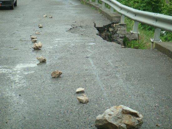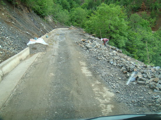 Der Zustand der Fahrbahn ist allerdings nicht immer der Beste und an vielen Stellen bricht die Fahrbahn zur Talseite hin ab,