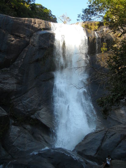 So machten wir uns auf den Weg zu dem Wasserfall und den sieben natuerlichen Pools, die er am Ursprung bildet. Dazu mussten wir 680 (!) STUFEN durch den Dschungel hochsteigen. In der feuchtwarmen Hitze des Regenwaldes ist dies etwas anstrengend. Es ist nicht vorstellbar, was das Urwaldviehzeug fuer Geraeusche macht. Wie auf dem Jahrmarkt! Kettensaegen, Hammer auf Amboss, Fingernagel auf Kreide, Kinderschreien...wirklich eine imposante Geraeuschkulisse! Und irgendwie beunruhigend...Oben angekommen, durchgeschwitzt und keuchend, erwartete uns wieder einmal ein grossartiges Naturschauspiel. Stromschnellen, stille Teiche, glasklares (eiskaltes) Wasser...es hatte sich also gelohnt.