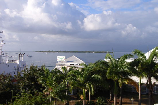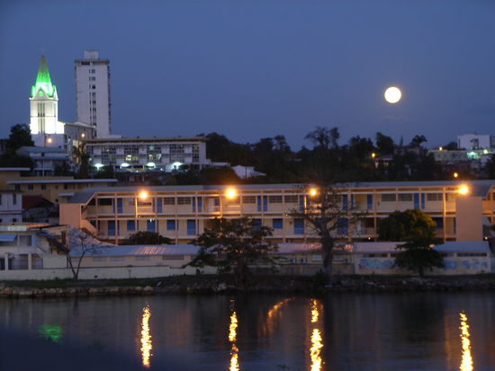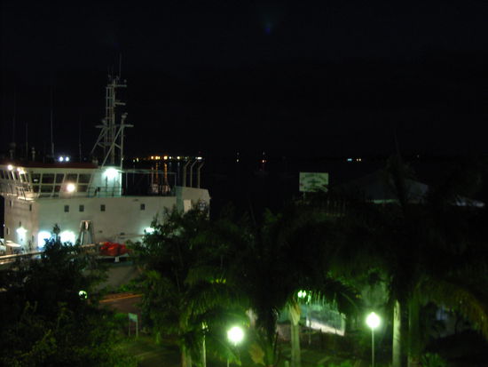 Abends bei Vollmond ein erstes CARIB auf dem Balkon, dazu AUTAN, es gibt natürlich ein paar Mücken. Blick auf das Hafenbecken, die Bucht und ein riesiges Kreuzfahrtschiff, das gleich neben dem Hotel liegt. DER URLAUB FAENGT AN.