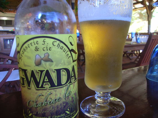 Trinken ein Gwada (lokales Bier) im angeschlossenen Restaurant. Endlich Bier aus Guadeloupe - wir dachten schon, die haben hier keine Brauereien!!! Die Kellnerin empfiehlt mir ein homöopathisches Mittel mit Arnika gegen das blaue Auge. Soll ich in der Apotheke holen, das würden auch Babys und Fußballer kriegen. Na dann PROST!!!