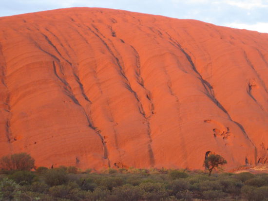 Morgenstund hat Gold im Mund und im unserem Fall einen spektakulaeren Sonnenaufgang am Uluru. Danach wanderten wir noch ein bisschen um diesen merkwuerdigen Monolithen herum. Mittags begaben wir uns zu den Katja Tjuntas, nicht weit entfernten aehnlichen Steinformationen. Doch die Hitze war unertraeglich und wir flohen zurueck zu unserem Pool beim Campingplatz und brachen spaeter unseren Rueckweg an. Die Nacht verbrachten wir auf einem freien Campingplatz (Das Wort Campingplatz ist weit uebertrieben), dem Heimatort des Sinking Dingo, der taeglich fuer die Touristen aufs Piano steigt und dazu heult.