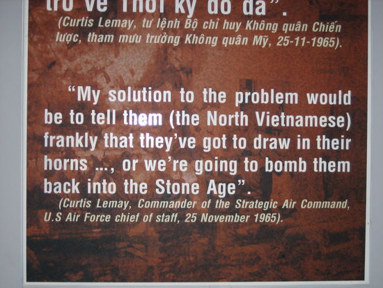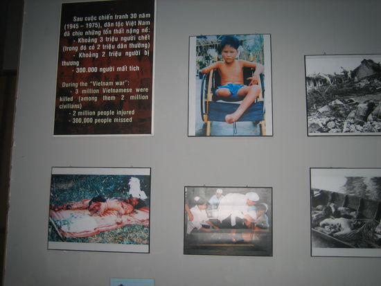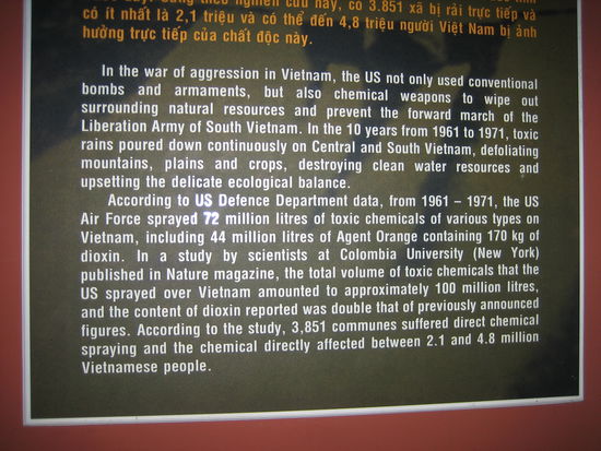 Die USA hat 72 Millionen Liter Agent Orange verspreuht. Eines der giftigsten Chemicalien dieser Welt. Nur um den Waelder zu zerstoeren, in denen sich die Vietnamesen versteckten. Millionen von Menschen erlitten Missbildungen und man muss nur vor das Museum gehen, um diese zu sehen. Und das Schlimmste: Die USA bestreiten bis heute die Zusammenhaenge der Missbildungen und Agent Orange!