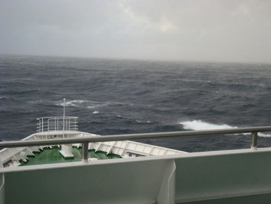 Aus dem zunächst sicher geglaubten Schiff mittlerer Größe wurde ungefähr um Mitternacht wahrlich eine wankende Nussschale- quasi zu jenem Zeitpunkt,als wir das japanische Festland verließen, das keine höheren Wellen zuließ.