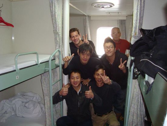 Die Koje teilte ich mit 3 Japanern und 2 Chinesen..die Stimmung war super und meine Verständigung mit einem der Chinesen ging über zwei Ecken.Der junge Japaner über mir übersetzte vom Englischen ins Japanische an den älteren Japaner und der wiederum durfte sein Chinesisch, das er vehement in jeder freien Minute büffelte an den Chinesen trainieren, das war wirklich Spass pur!