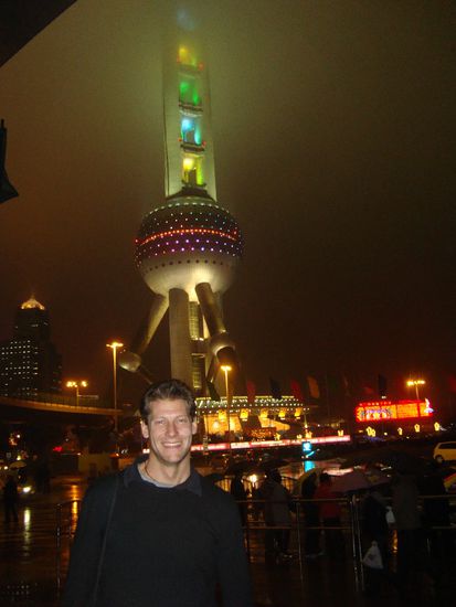 Die obere Hälfte des Oriental Pearltower verschwand bei dieser Aufnahme irgendwo in den Regenwolken, wenigstens ging der "tall"-Pete hier nur in der unteren Hälfte flöten, ließ sich kaum anders machen, denn schliesslich wollte ich den Rest vom Turm nicht auch noch verdecken. Große Menschen haben hier einzig bei manchen Busfahrten den Kopf unten zu halten, ansonsten kommt in China in keinster Weise das Gefühl der Beklemmnis auf.