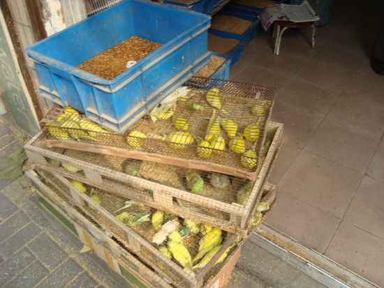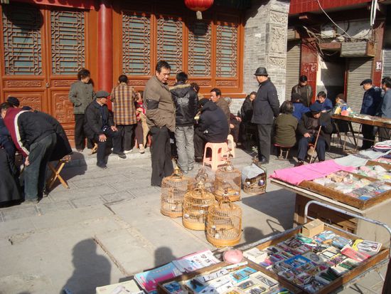 Das gesellschaftliche Zusammensitzen in China ein viel gesehenes Bild. Die Tiere in den Käfigen gehören hier allerdings auch dazu.