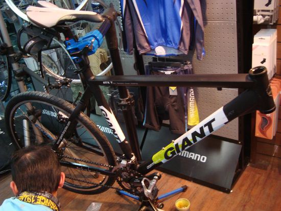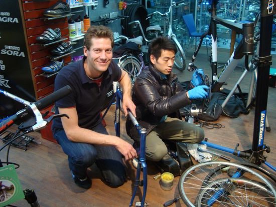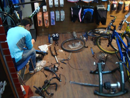 Apropo Platz..den gabs hier bald nicht mehr..Da hatte ich in Shanghai doch zunächst nur die Idee, mir größere Reifen zu meinem Rennrad zu besorgen. Was aus dieser Idee letztlich wurde,das zeigen die nächsten 4 Bilder! Also das Problem war schlechthin, daß die Reifengröße, die mir vorschwebte, nicht mehr in (unter) meine Bremsbackenhalterungen paßte (blabla)-Fazit: es musste ein Mountainbikerahmen her mitsamt neuen Laufrädern und neuer passender Kurbel. Die Kosten halten sich im Vergleich zu Deutschland allerdings sehr im Rahmen, sprich ein Viertel.., alles in allem also ein günstiges neues Rad!!