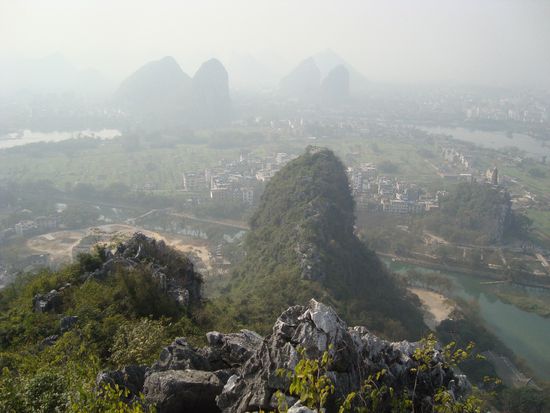 Guilin in der Guangxi- Provinz liegt inmitten der weltbekannten Pineapplepeaks, einer außergewöhnlichen Landschaft! - wahrlich nur zu bestaunen. Die Stadt selbst ist von diesen Bergspitzen wie eingebettet. Es gibt daher etliche Aussichtshügel,von denen man sich einen Eindruck aus der Vogelperspektive verschaffen kann. Man sollte jedoch nicht den Fehler machen und alle Gipfel erklimmen wollen, das würde in nichtendendem Stress ausarten. Es ist ebenfalls empfehlenswert, in gutes Schuhwerk zu schlüpfen und einen abenteuerlichen Aufstieg wagen,(sollte man sich dies körperlich zutrauen), statt Geld für einen der Touristenhügel zu bezahlen, dessen gepflasterte Pfade zum Gipfel führen und man sich beim Rückmarsch auf den Füßen herumsteht.