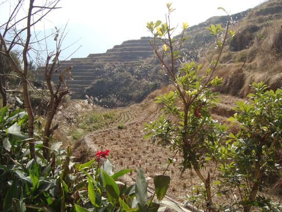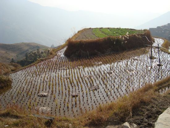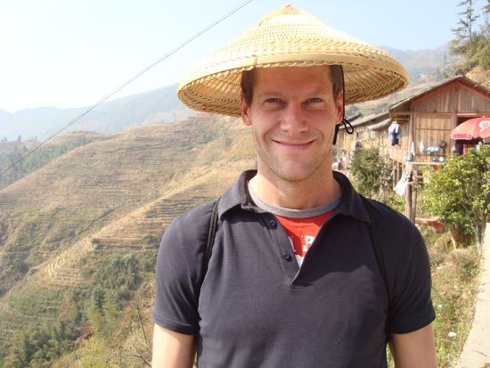 Oben auf den Ping'An Zhuang- "Sonnen"- Terassen war ein Kopfschutz schon mal ger nicht verkehrt.